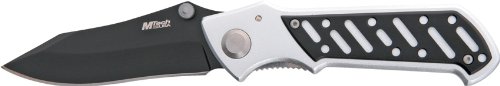 MTech Linerlock. . MTech Linerlock couteau noir et blanc. Mesure 11,3 pouces lorsque fermé. Noir peint lame acier. Poignée d'argent finition aluminium. Clips de poche en acier.