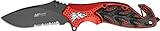 Sauvetage de couteau MTech Linerlock. Mesure cm 11,8 cm lorsque fermé. lame acier 440 partiellement dentelée de 8 centimètres. Grande poignee en aluminium rouge avec insert noir et argent crâne en relief. Bris de verre et ceinture.
