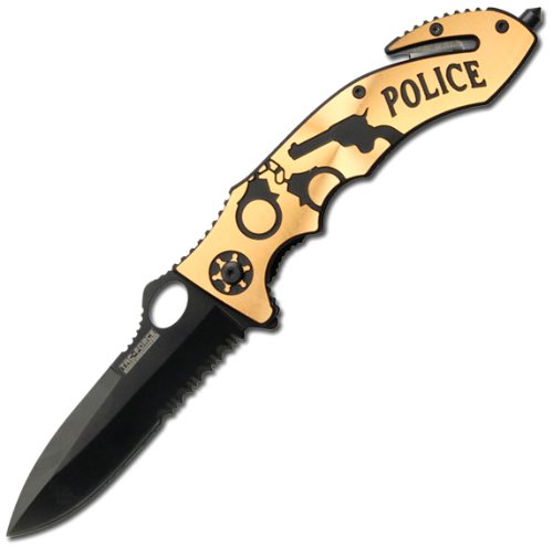 Misc Speed Assisted Rescue?Misc vitesse assistée sauvetage Framelock. Mesure 13.65 centimètres d'une société fermée. 10 cm lame noire en acier inoxydable avec finition noire partiellement dentelée avec trou pour votre pouce. Grande poignee en aluminium avec des caractéristiques de couleur rouille. Ceinture intégrée en verre taille et frangi.
