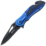 | ✚✚✚ MTech Rescue Linerlock Navy Couteau Mtech mesure Lock Marine Rescue 11,3 pouces fermé. 8,3 cm lame partiellement dentelée 440 acier manche couteau, bleu électrique anodisé en aluminium. Ceinture intégrée en verre taille et frangi.