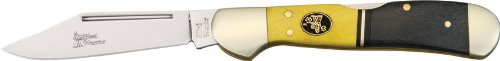 #Gel Lockback couteau acier guerrier. 9,3 cm mesure de fermeture. lame en acier 440 de 6,6 cm. Poignée en os lisse noire et jaune avec un séparateur. Mitres maillechort. Frost en acier guerrier Logo de bouclier d'argent.
