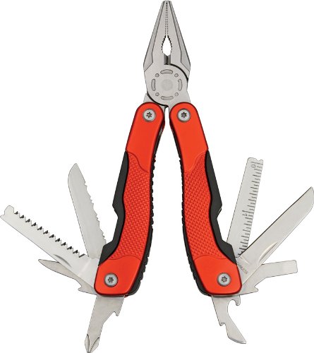 China Multi-Tool.?Outil polyvalent. Mesure 10 pouces de fermé. Poignées en aluminium et de tissu rouges. Outils en acier inoxydable. Caractéristiques : pince à bec effilé avec coupe fil, lame dentée, lame tournevis grandes et petites, tête fendue de bord standard de grande et petite, tournevis, ouvre-boîtes, lima et règle métallique. Étui en nylon noir.