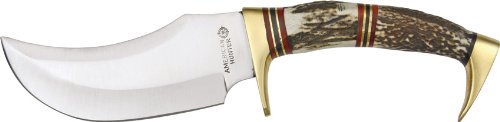 #Couteau de chasseur américain. Mesure totale 25,40 cm. Cm lame plate. 12,70 acier chirurgical. Manche en corne véritable avec entretoises en bois rouges et laiton. Finitions en laiton. Étui en cuir brun.
