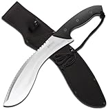 Machette Mtech fixe lame khukuri. Mesure de 47,6 cm au total. acier de lame 33 cm miroir poli khukuri 440 avec sawback supérieure pleine tang. Noir poignée avec texture caoutchoutée. Trou de la sangle avec cordon en nylon. Gaine inclus.
